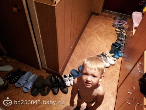 Сестра помыла пол в прихожей пока мы были на улице. обувь на время в кучу сложила. Тут приходим с улицы и сын увидел эту кучу. Пока мы переодевались Богдан решил порядок навести!