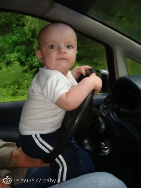 ахаха) моя сразу за руль 2мя руками хватается, стоит только посадить вперед!))