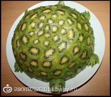 Так как у меня есть киви, я нарезаю киви и выкладываю его на торт. Вот и получается такая вот черепашка.