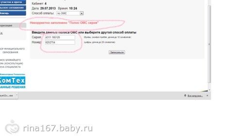 Новороссийск. kuban-online.ru 23 июля 2013 22:30 Запись на прием врачу кто регистрировался? У меня постоянно ругается на полис. А службы поддержки нет Комментарии Пожалуйста, будьте вежливы и доброжелательны к другим мамам и соблюдайте правила сообщества ПожаловатьсяСкопировать ссылку Анна Евочка15 лет Новороссийск Такая же беда не могу записаться, тоже самое выдает. Полис тоже старого образца. ПожаловатьсяСкопировать ссылку ПростоКатя Ангелиночка14 летВладислав11 лет Новороссийск У меня так было, когда я дочу хотела записать в 5, а относимся к 1. ПожаловатьсяСкопировать ссылку Nimeris Алёша14 летАнтоша11 лет Новороссийск Сырой он какой-то. В mctreg.ru вашей поликлиники нет?ПожаловатьсяСкопировать ссылку kroxa me Милана17 летНиколь13 лет Новороссийск спасибо за сайтик но я опять с полисом затупила чего они от меня хотят? ПожаловатьсяСкопировать ссылку kroxa me Милана17 летНиколь13 лет Новороссийск ПожаловатьсяСкопировать ссылку kroxa me Милана17 летНиколь13 лет Новороссийск у доченьки старый полис, какие номера надо вбивать? ПожаловатьсяСкопировать ссылку Nimeris Алёша14 летАнтоша11 лет Новороссийск Даже не знаю, у сына новый. У вас сколько цифр в номере полиса? ПожаловатьсяСкопировать ссылку kroxa me Милана17 летНиколь13 лет Новороссийск а кинь как пример. я свой новый немогу найти, а младшей дочи тоже новый с моим был. ПожаловатьсяСкопировать ссылку Nimeris Алёша14 летАнтоша11 лет Новороссийск У сына такого плана (серия и номер — справа внизу, 4 и 7 цифр соответственно): ПожаловатьсяСкопировать ссылку Nimeris Алёша14 летАнтоша11 лет Новороссийск Ок, отлично приложила картинку. ПожаловатьсяСкопировать ссылку kroxa me Милана17 летНиколь13 лет Новороссийск а букв нет? ПожаловатьсяСкопировать ссылку Nimeris Алёша14 летАнтоша11 лет Новороссийск Неа, у нас с сыном цифры только. ПожаловатьсяСкопировать ссылку kroxa me Милана17 летНиколь13 лет Новороссийск ну серия значит вот так 4444 а номер 7777777 ПожаловатьсяСкопировать ссылку ЛеДи Елисей13 летЛикерия7 лет Краснодар Попробуй пустой оставить строчку.ПожаловатьсяСкопировать ссылку kroxa me Милана17 летНиколь13 лет Новороссийск Я зарегистрировалась а именно когда Милку записываю на прием врачу там поле это обязательеое пишу номер ее полиса пишет что еет такого ПожаловатьсяСкопировать ссылку ЛеДи Елисей13 летЛикерия7 лет Краснодар я точно уже не помню, у меня тоже был этот глюк ПожаловатьсяСкопировать ссылку kroxa me Милана17 летНиколь13 лет Новороссийск ПожаловатьсяСкопировать ссылку Ѽ-Вишенка-На-Торте-Ѽ Никита12 лет Новороссийск это не в сайте дело, а в враче)))) походу даже сайт не хочет к Сажневой вести запись))))) Предыдущая статьяДевочки посоветуйте, где бы вы могли увидеть рекламу?Следующая статьяЮлечка с Днем рождения!Актуальные постывынужденный переход на смесь- как начатьсдавала кровь из пальца кровь не свертывалась