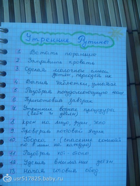 всем привет ну что отчитываюсь я перед вами мои хорошие, последнее время у меня с этим проблемы так как мы целыми днями в бассейне или на детской площадке, потомучто дома седеть при такой погоде нереально.но домашние дела и рутины я выполняю, раковина чистая)))работать по плану мне нравится.вобщем то я очень довольна.что касается заповедей то они мне очень понравились, но про интернет конечно-ето проблема.)))
