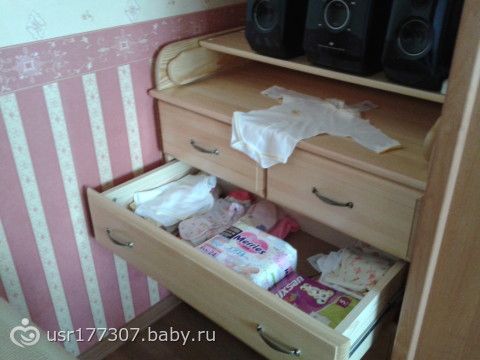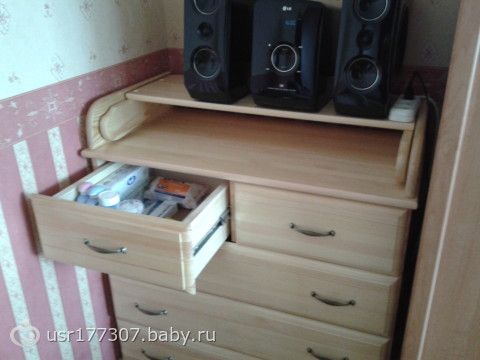 это пеленальный комод (пока приспособили под музыкальный центр) и колыбелька.