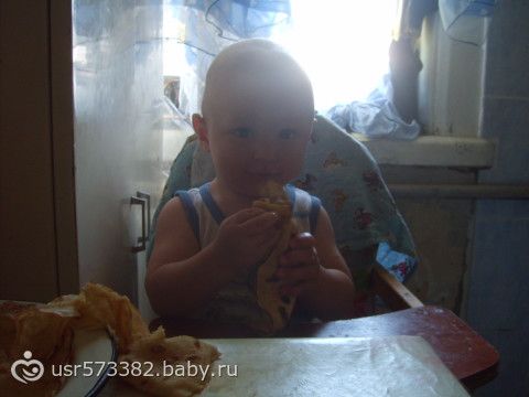 Такое чудо растет))) Стал большим музыкантом: подползает к бонго и давай в него стучать! Берет две погремушки — маракасссыыы)))) и главное так подтанцовывает, подпрыгивает на попе и головой машет))) Не отписались мы в 10 месяцев))) были месяц у бабули, отъедались ягодками))) ели все и много!!!))) Жаль, нет фотоотчета((( Сынуля уже совсем большой: 10800 г. и 76 см. Мы едим почти все, что можно — творожки, печенье, каши(варим теперь сами, только с утра детская многозлаковая))), в обед супчики, на полдник бананы, ягоды, яблоки. А вечером едим овощи или вермишель с мяском)))) Обожаем мамины блины)
