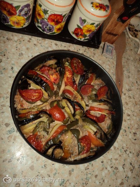 Фарш смешать с рисом, добавить мелко нарубленный лук, тертый чеснок, соль, перец, яйцо и хорошо вымешать и отбить. Дать настояться 10 мин, сформировать котлетки. Кабачок, баклажан, помидоры, перец, картофель, лук нарезать кольцами. 5 ст. л. оливкового масла смешать с тертым чесноком и специями. 3 ст. л. томатной пасты развести в двух стаканах воды, подсолить. В смазанную маслом форму уложить чередуя овощи и котлетки (Я оставшиеся ломтики помидора и перца выложила на котлетки). Обмазать смесью масла, полить разведенной в воде томатной пастой. Накрыть фольгой, отправить в разогретую духовку. Выпекать 40 мин. в фольге, снять фольгу и выпекать еще 15 мин.