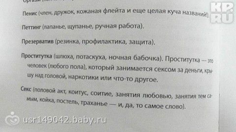 Напомним, энциклопедия понятным для детей языком рассказывала, откуда берутся дети. При этом ее авторы для чего-то решили провести ликбез и по анальному и оральному видам секса, а также объяснить, как, кроме как «проституткой», еще можно назвать женщину, торгующую своим телом.