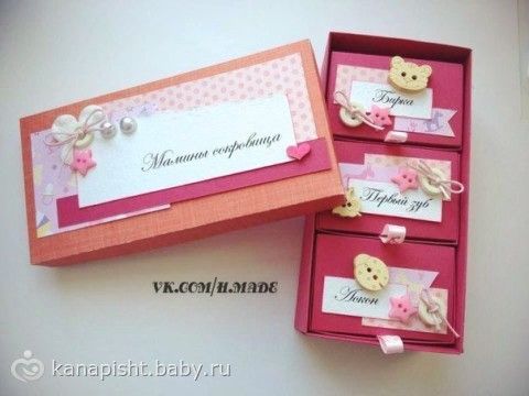 В общем, ближе к теме. Подруга нашла ВК совершенно восхитительные коробочки для хранения всего самого ценного для мамочки — бирочки с роддома, полосатого теста, первого зубика. Выглядят они примерно так: