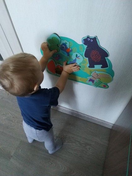 Мы как раз выбрали пазл — и там детали очень большие ( что мне и понравилось ) потому что, мы еще пока любим все брать в рот! Пазл красиво и аккуратно упакован, подойдет для подарка как и девочки так и мальчику. Большая упаковка, все сложено здорово! Крепится на стену или любой шкаф. Можно ее хоть несколько раз брать и переносить в другое место, и он не портится. Так же хорошо держится))Сейчас мы подходим к нему, начинаем изучать детали и стараемся прикреплять их к основному пазлу.