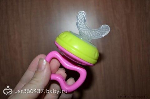 для прикорма — кусочек яблочка положил, а детка сама из него пюре делает — мусолит во рту и через дырочки выходит пюре, чтобы не подавился.