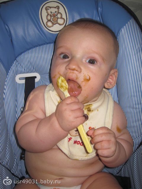 12.08. Сегодня уже третий день, как мы кушаем. Первым пошел кабачок фирмы Хайнц. Начали с чайной ложки, постепенно увеличиваем дозировку. Высыпаний (тьфу-тьфу!) нет, стул в норме. Кажется, Владику даже понравилось. Сам ротик открывает, к ложечке тянется. На днях заказала ему стульчик для кормления. Теперь он совсем как взрослый. Такой довольный!!!
