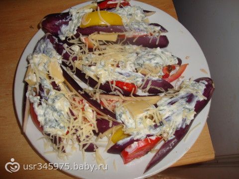 Сверху баклажаны хорошо обмазать майонезной смесью (можно просто майонезом), стараясь попадать в разрезы.