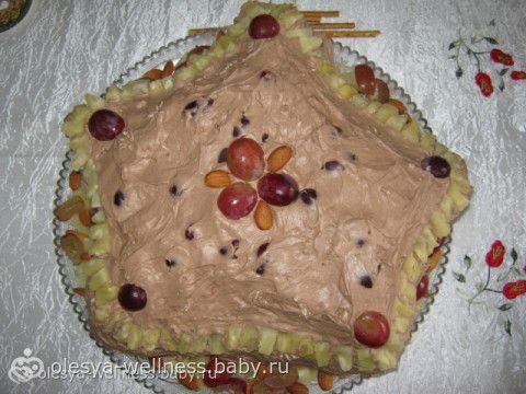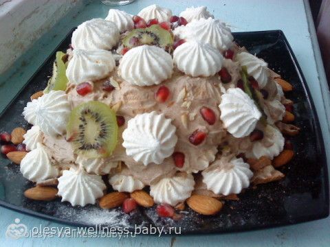 Раскладка!!! на подносе мажешь его той формой, которую хочешь получит из торта:)) и выкладывешь безешки поочередно-как этажи:) между ними сыпя орехи и прокладывая фрукту/ы и снова кремом промазываешь- и так- слой за слоем:)))