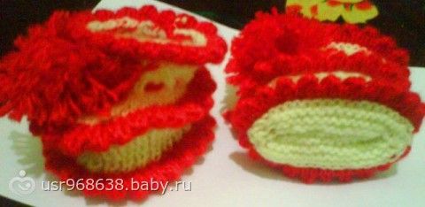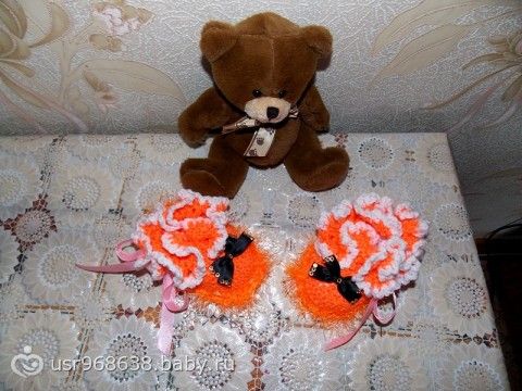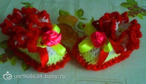 Крючком все кроме предпоследних(красно-желтых)...я раньше тоже не вязала, потом захотела вот пинетки связать и начала сразу с них, не хотела учиться сначала и тренероваться, а хотела все и сразу!))) Ну так вот взялась за это дело, научилась читать схемы, и в путь!3 раза распустила пинетку первую и научилась потом… нет не чего сложного, я сама схему совмещала с 3х разных схем!