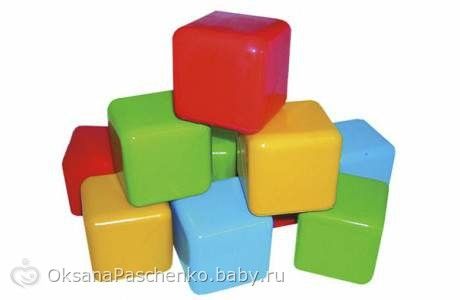 Отбери крупные пластмассовые кубики и предложи сидящему ребенку: “Маша, давай построим большую башню!” И покажи сама: проговаривай при этом свои действия: “Вот первый кубик, поставим на него другой кубик, и еще один… Вот у нас башня какая – высокая-высокая”. При этом – подними ручки ребенка вверх. После такой постройки обязательно похвали своего маленького строителя: «Маша, молодец! Построила башню!»