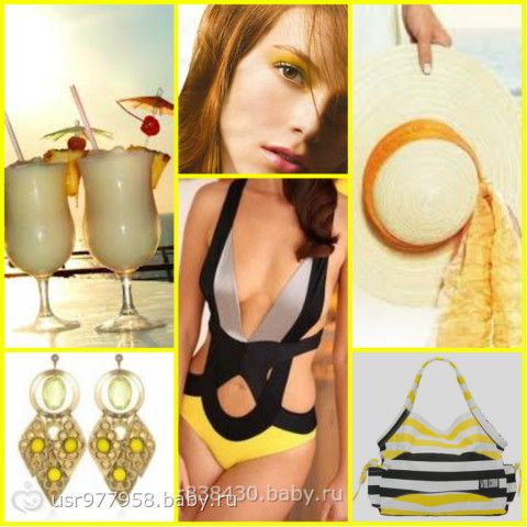 2. В коллаж может входить всё, что угодно: аксессуары, обувь, парео, макияж и т.д. Это как вы себе представляете образ к данному купальнику)
