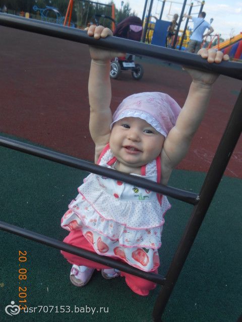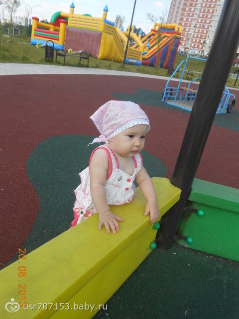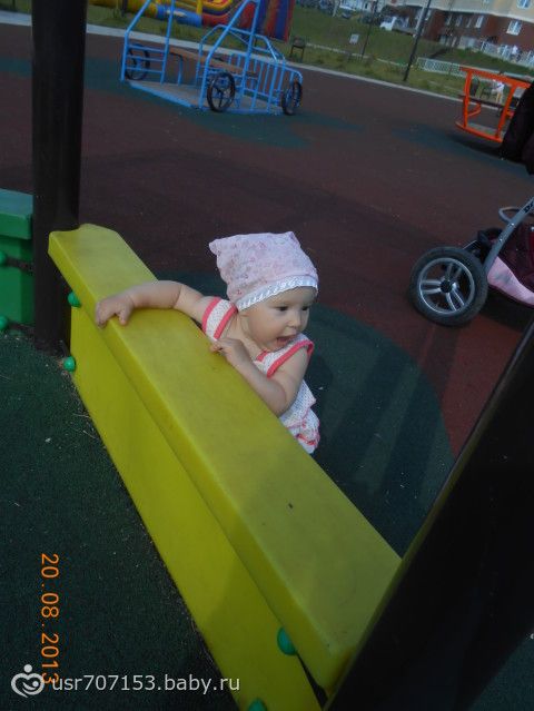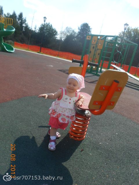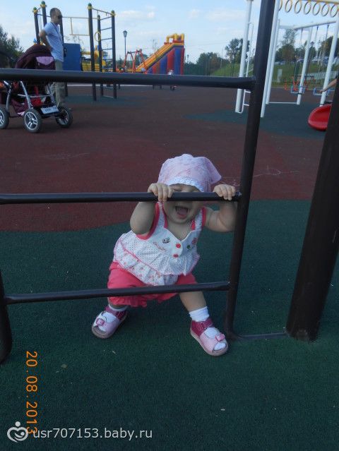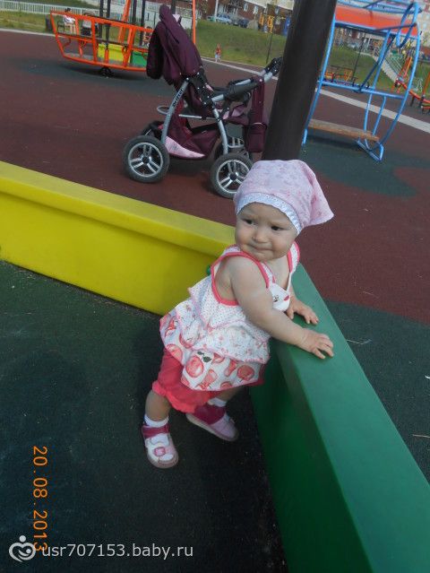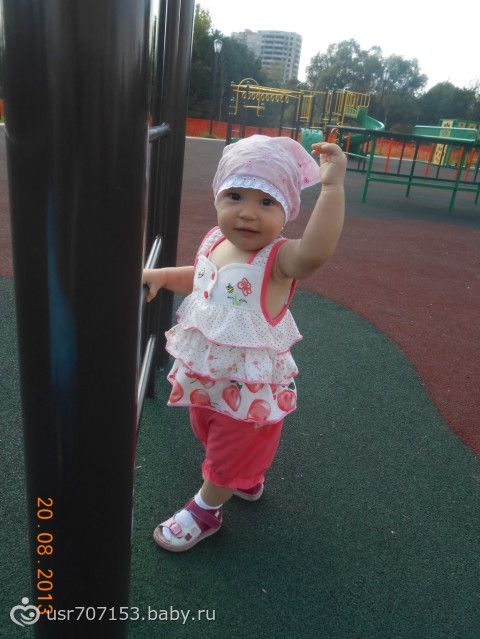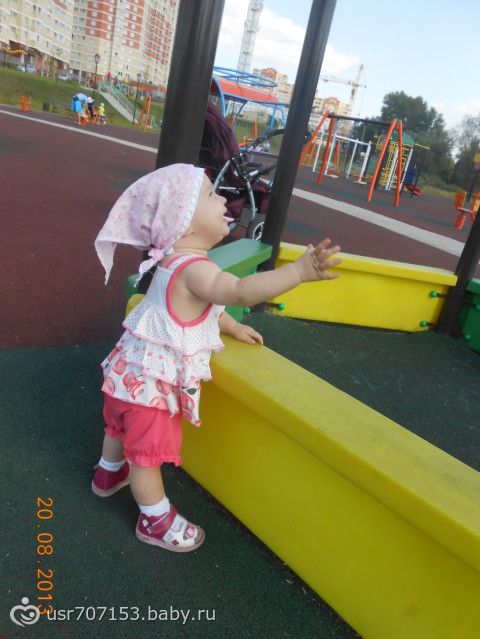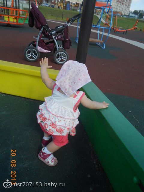 Сходили на часок на площадку.Выпустила дочу потопать.А то сколько можно сидеть в коляске и наблюдать как топают другие малыши.Нам ведь тоже хочется.Нога немного подросла и сандали теперь не кажутся большими.Радости не было предела