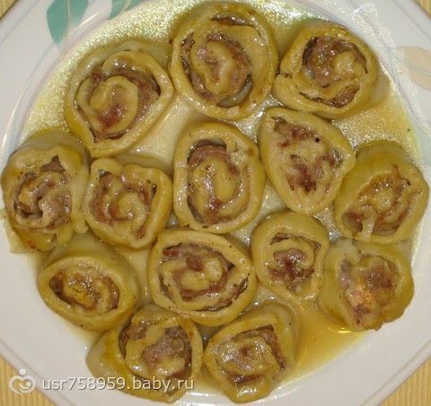 Делаем тесто (у каждого своё, у меня самое примитивное): 2/3 стакана воды, 2,5 стакана муки, 1 яйцо, соль на глаз. В фарш немного водички, чтобы был мягкий и сочный, соль, перец. Замешиваем тесто, раскатываем в прямоугольник тоненьким слоем. Намазываем вилкой фарш тоненьким слоем по всей поверхности, оставляя один край немного свободным. И заворачиваем как в рулет (точно так же как рис на нори для суши), потом этот рулетик в морозилку ненадолго, а потом достаём и нарезаем. Получается вот так: