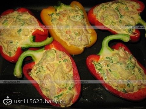 Теперь на противень, на котором будет готовится курица в перце выкладываем половинки перца. В каждую половинки накладываем уже готовую начинку с курицей.