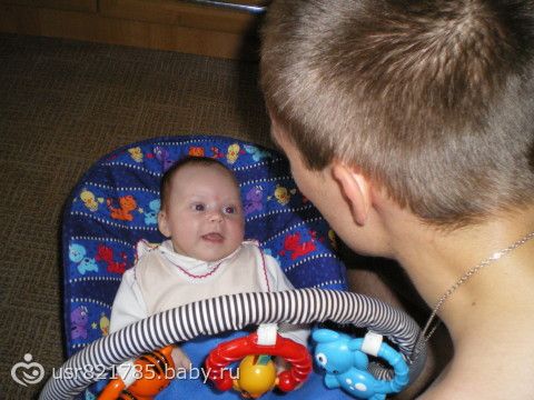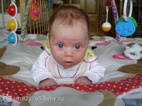 Небольшое отступление.8 августа моя крошка начал кашлять. сопелек нет, темп. тоже.12 пришла Трошильда и поставила фарингит.пили мы неделю лазолван, потом свечи виферон, проходит пару дней и она опять кашляет.ну не так чтобы сильно, но подкашливает.да и раньше подкашливала.в начале свекровь пела мол зачем ты врача вызвала мол само пройдет, потом сказала лечить скипидарной мазью мазать грудь и пятки.ну я нанесла.на след.утро у дочи была сыпь на груди, небольшая, но больше я не экспериментировала.28 она тут раскашлялась.я сказала свекрови.ну прямо утром так кхекала конкретно.свекровь посмотрела мол все… полная ***… пора пить антибиотики… и какие то там говорит.я позвонила сестре и она посоветовала съездить к врачу Елене Анатольевне она работает в патологии для новорожденных.Мы один раз к ней уже ездили когда я еще грудью кормила.короче вечером я собралась к ней.Свекрови сказала об этом(кто не знает свекровь раньше была педиатром).вечером мы поехали с папой и масей в брагино и п***ли в такую ж.о.п.у.1,5 час в пробке с малышом.а она у меня вообще шумахер, любит только быструю езду и на светофорах даже нервничала мол че стоим… газу дед!!! короче когда уже начало темнеть мы приехали в больницу.Е.А. меня успокоила, я конечно извинялась что опоздали и так поздно приехали(не люблю опаздывать), сказала нам, что ничего страшного.посмтрела нас сказала что никаким фарингитом здесь не пахнет.просто от слюней она периодически кхекает.а уж если бы заболела то кроме горла были 100% сопли и возможно темп.еще сказал что как она может заболеть если дома и все кто с ней контактирует здоровы.Мы взвесились.я в принципе дома с ней на весы встаю, а они у меня как в больнице 1 в один.Масечка весит 6 325 прибавили 1 кг 200 гр и рост 60,5 см(выросли на 2,5 см).в общем Настенька ей понравилась симпатичная девчушка все в норме.по таблице растем как надо.Спросила наболевшее про прикорм.рассказал историю и споры со свекровью.Она посмеялась и просила передать свекрови что сейчас педиатрия изменила свои взгляды на прикорм.Все и кто на гв и кто на ив прикорм начинают с 6 месяцев, с овощей.сок фруктовый вводят с 9 месяцев.но никак не с трех, как говорила свекровь.Короче сегодня звонила свекровь и я ей все сказала.ой.как она была недовольна.я думала у нее крышу сорвет от возмущения и негодования от того, что я не хочу делать как она!!! раз мы здоровы.пойдем к трошильде чтобы нам добро дала на прививку во вторник и сделаем прививку.перед этим по советы сестры буду давать фенистил.Ну и достижений с 2,5 месяцев у нас шипко никаких нет!!! Мася просто радует маму и папу, особенно когда какает(никогда не думала, что так буду радоваться детским какашкам).Все читаю, что уже переворачиваются, а мы нет!!! Муж мне тут как то выдал.У нас Мася во фрукт превращается? я в какой, он, с гордостью, в банан!!!!!