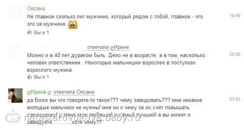 В принципе, шут бы с ней. Но это было в моем профиле под нашей общей с Мишей фотографии. Я не вмешиваюсь обычно в диалоги, если они на прямую меня не спрашивают. Народ Ей ответил и понеслось...