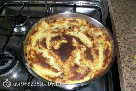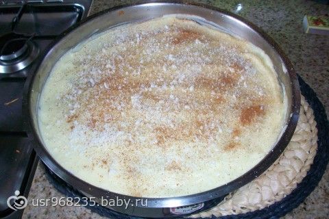 Сверху я посыпаю корицей и тёртым сыром.Форму ставлю в духовку примерно на час при т" 200«С.Надо проверять, когда подрумянится крем.Тогда блюдо готово!