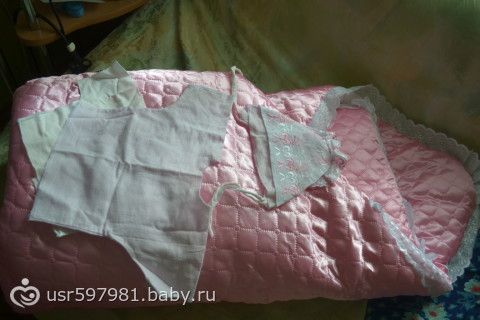 Продам конверт для выписки .В комплекте: сам конверт(одеяло на лепучке), уголок, подушечка,2 чепчика(теплый и хб красивый),2 распашонки.