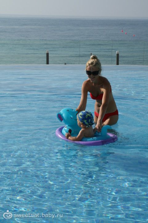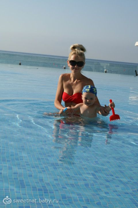 У нас был просто фантастический отель) Игорюня как только увидел бассейн и море-завизжал от радости, стал вырывать с рук и просто побежал в воду)))) 3 дня его было просто не вытащить) потом бегал по берегу, очень нравилось как волны набегают) Нырял-сам) Я в шоке просто была) Я его бросала с берега бассейна, а муж стоял в воде по грудь-он Игорюню ловил. Игорек просто заливался от восторга и вот Игонрюня сам разбегается и прыгает в воду, а муж стоял подальше… я в шоке, вижу как сладкий уходит под воду, кручу мужу, муж быстро его выхватывает из воды, а Игорюня с удыбкой, даже не кашляяя, т.е. задержал дыхание, опять рвется в воду)))) Рыба моя)))
