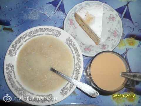 Завтрак: овсянка, ложка меда, кофе с молоком, кекс