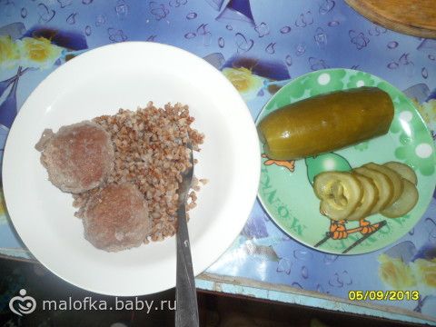 Обед: гречка, котлеты, огурец (съела только те, что нарезаны), чуть соевого соуса