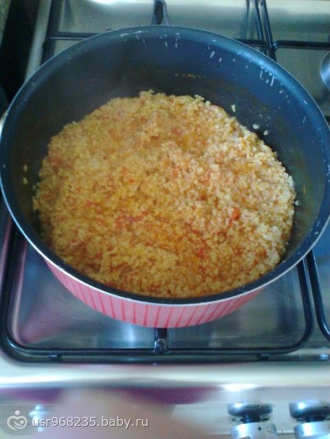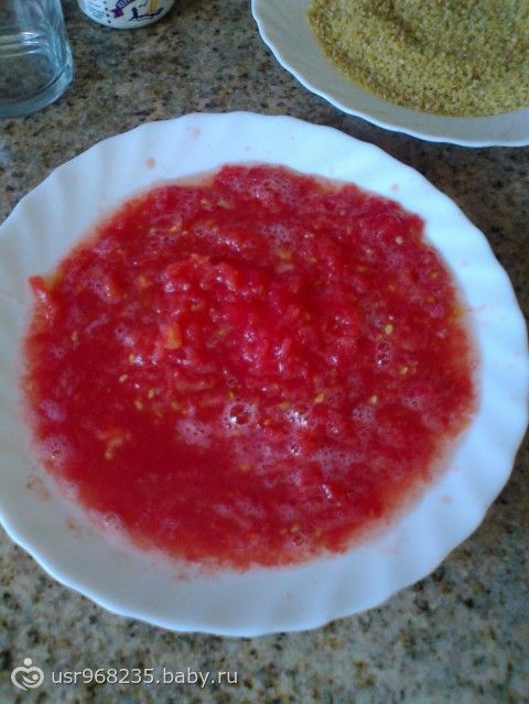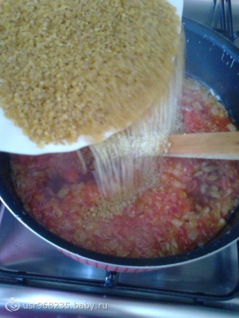 Нам нужно:1-2 луковички, мелко нарезанные,1 стакан пшеничной крупы, рубленой,1 стакан томатного пюре или сока(я тру томаты на тёрке обычно),4.5 стакана воды, соль, оливковое масло.