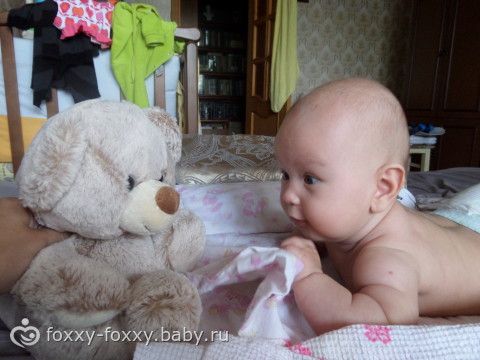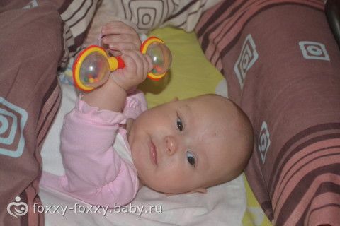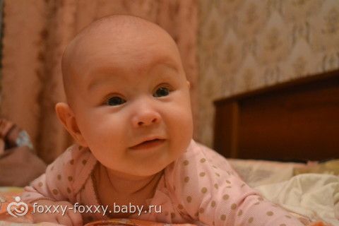 У нас всё хорошо. Растём и развиваемся)) Становятся малы вещи на рост 62, весим уже 6,5 кг)) Пока ещё на ГВ. Катюшка очень любит улыбаться и смеяться в голос)) Болтает без умолку: «аааа», «ай», «агу», «ги», «мааа», «ня»)) Колики прошли, остались газики. И начал лезть первый зуб))) Каждый вечер и по полночи у нас веселуха — плачем без остановки. Пытаемся развлекать, отвлекать — получается, но ненадолго. Мооооре слюней и постоянно руки во рту)) Купили гель для прорезывания зубов «Первый зубик», натуральный, на травках — вроде помогает, успокаивает, но ненадолго. Стали меньше спать, очень беспокойно. Спит по большей части с нами в кровати, но и в своей кроватке наконец-то начала засыпать. Недавно наконец сделали прививки: АКДС + Гепатит Б в одну ножку и Полиомелит — в другую. Реакции никакой не было, температуры тоже — пронесло. Я наконец-то ем уже всё подряд — это такое счастье)) А ещё спим по ночам с 2,5 месяцев, несмотря на газики — теперь есть ночной перерыв в кормлении, хотя и нет устоявшегося расписания, потому что начал лезть зубик — засыпаем в промежуток с 23 часов до 3 часов ночи, но и спим до 7-10 часов утра. Катюшка уже уверенно переворачивается с живота на спину и наоборот)) И ещё сама хватает погремушки) Вот такие вкратце наши дела)) Жду ваших рассказов) Ну, и несколько Катюшкиных фоточек: