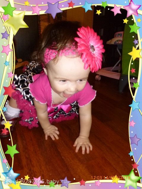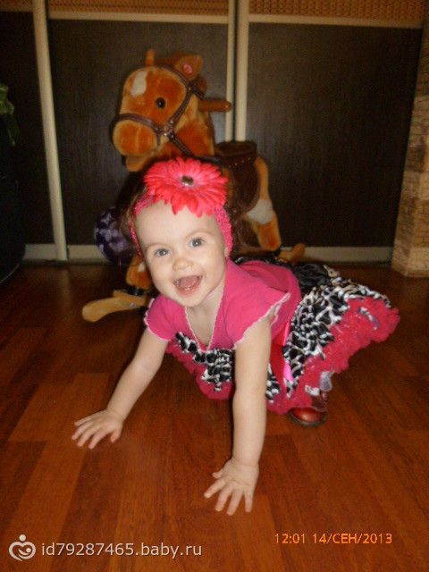 У нас пока только 2 зубика, ходим уже по квартире, прыгаем как попрыгунчик всегда и везде(так забавно), говорим не много правда, в основном только и орет МААМААААА!!!!!!!))))Иногда проскакивает папа, дядя или тятя(не пойму))))… Кушаем мы уже все и мнооогоо, что ни дай, все слопает, ттт!!! На приеме пока небыли, но видно что подросла за месяцок)