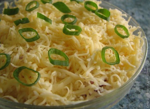 Салат получается теплого цвета, солнечно-желтого. Добавим к нему зеленых красок, украсив кольцами зеленого лука. Очень аппетитно.