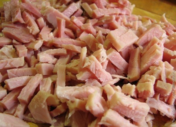 Как правило, солить этот салат не надо, потому что ветчина, маринованные грибы и твердый сыр сами по себе достаточно соленые.