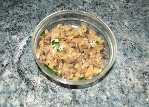 Остальной лук выкладываю вторым слоем в салатницу. Делаю майонезную прослойку.