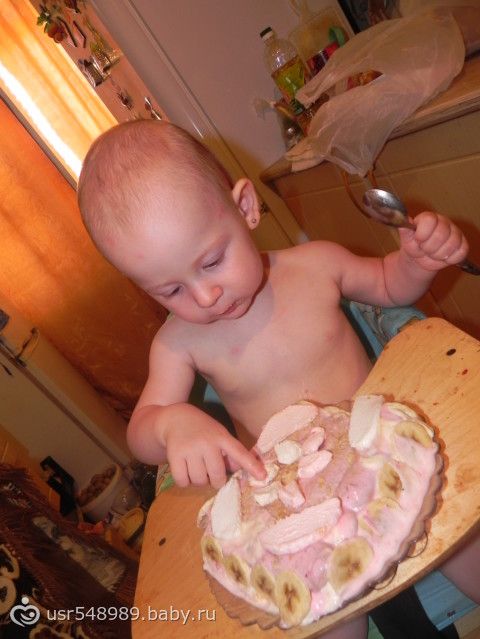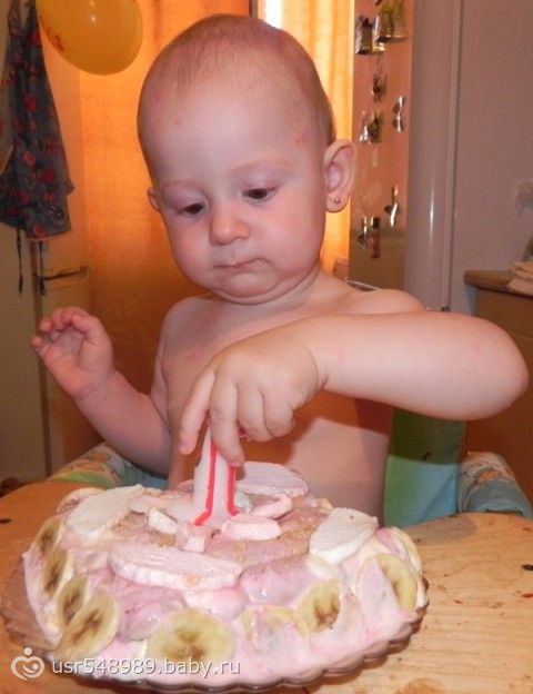 Всё никак не дойдут руки написать про наш День Рождение, наконец собралась по маленьку с мыслями.Итак, раннее утро прекрасного дня 12.07.2013 года… Позвонил дедушка(мой папа) и сообщил, что пора его встретить и открыть дверь, София ещё спала.На пороге дед с цветами из воздушных шаров, открыткой и красненьким ювелирным мешочком)))в этом мешочке золотая совсем не детская цепочка=)Решили разбудить дочку и внучку вместе, мы с мужем с тортом, который я делала на кануне вечером из детского печенья, банана, киви и творожка, в нём свечка с циферкой 1.Когда дочка проснулась, она наверно долго не могла понять что же с ней происходит, вся комната украшена шарами, и дед с утра, с какими то поздравление, а главное тарелка с чем то вкусным в которое вставлена горящая штука, которую всё время просили задуть и не давали трогать)))))))и к тому же разрешили кушать так, как хочется и чем хочется)))