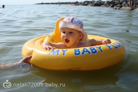 На следующий день решила действовать похитрее и помедленнее… Сначала играли с песком… постепенно продвигаясь к воде… А там детвора просто «кишела», рядом с нами расположилось семейство с 3-мя пацанами, двое уже подросших с разницей года в 2-3, а третий малыш 3-х месяцев!!! Так вот старшие резвились с папой в море, и моя на них поглядывала… Я села в воду и начала предлагать ей наш ярко-желтый круг! Но не тут то было, ей он был неинтересен, зато заинтересовал круг одного из мальчишек — с рулем…