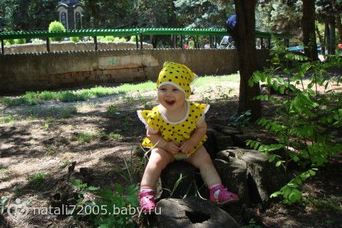 Там солнце было очень сильное, а она в свое кофте в море упала, я на нее свою блузку нацепила, а чтобы не сваливалась — сзади на спине возле горловины резинкой для волос стянула. Спереди этот «кукиш» не видно… даже стильненько получилось :)