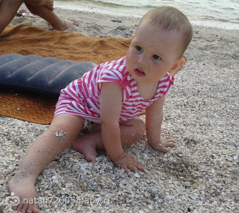 Доверчиво пошла за мамой к воде… Насторожилась… и как только первая легкая волна достигла ее тапочек, ринулась к маме на руки!!! И все!!! К воде больше ни ногой… так и гуляла я с ней по берегу на руках…