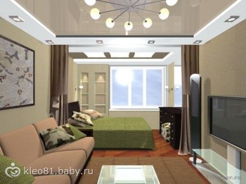 В общем как на фотке выше будет, примерно так. Только стороны другие у нас! Смотришь со стороны двери в комнату, в конце балконный блок, дверь балконная слева. С правой стороны кровать, напротив неё у другой стены комод. Дальше: справа возле кровати диван максимум 150 длиной, ну после дивана уже дверь. Со стороны комода дальше стол, ещё дальше стенка. Ну а потом уже детский закуток)) Детское место отделим занавеской. Я прикинула по размерам, всё влезает! Диван напротив стенки будет и между ними достаточно места! Большинство вещей у нас будет в шкафу в прихожей, остальное в комоде, прикроватных тумбах и небольшом отделении в стенке. Ну ещё антресоль на кухне, сам балкон также. Над кроватью можно буквой П сделать место для хранения, просто это уже затратнее, да и опять же мы лично пока не видим смысла в этом. И конечно шкафы мы будем делать до потолка!