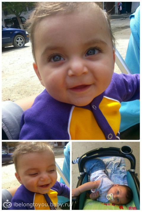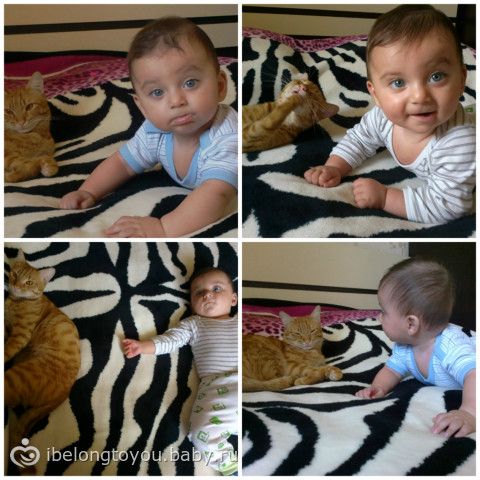 Что нового мы умеем? Поем песни, радуемся приходу папы с работы, тянем в рот абсолютно все, издаем новые звуки, плюемся (!), лупим себя по пузу и пр. Меня пугает его отношение к Персику, они как 2 брата млин, везде вместе. Кот мой уже полулысый, т.к. сына не упускает ниодной возможности подергать его за хвост, уши, усы, гриву. Целыми днями ругаю его за это и гоняю рыжего.