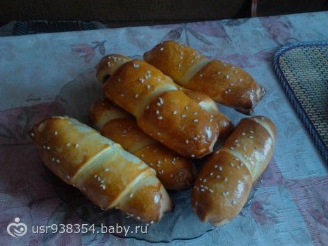 РЕЦЕПТИК: 150мл молочка тёплого смешать с сухими дрожжами 12гр, и 1ст.л сахара — пусть постоит минуть 10. дальше в мисочке взбила растопл масло 30гр, 1ст.л раст. масла, 1ч.л соли и добавить в дрожжи. дальше муки 400гр вымесить и на час в тёплое место. раскатать, порезать на полоски и замотать сосиски(у меня 10шт было) но чтоб не оставалось тесто, шт 13. смазать желтком, присыпала кунжутом и печь 15м при 200гр.