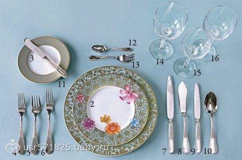 1. Тарелка для горячего. 2. Закусочная тарелка. 3. Тарелка для хлеба. 4. Закусочная вилка. 5. Вилка для рыбы. 6. Столовая вилка. 7. Столовый нож. 8. Нож для рыбы. 9. Закусочный нож. 10. Столовая ложка. 11. Нож для масла. 12. Десертная ложка. 13. Десертная вилка. 14. Бокал для воды. 15. Бокал для белого вина. 16. Бокал для красного вина.