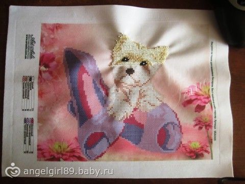 Сейчас я решила попробовать себя в частичной вышивке, вот тружусь над картиной «Собачка и туфли» (не судите строго, материал сильно стягивается):