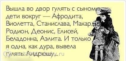 хахаха Андрюша)))))))))))))))) 29 сентября 2013 12:41 Комментарии Пожалуйста, будьте вежливы и доброжелательны к другим мамам и соблюдайте правила сообщества ПожаловатьсяСкопировать ссылку Ирина Вареник13 летКатенок13 лет Зеленоград я 50 на 50. Как по моде с Варей и как дура с Катей ПожаловатьсяСкопировать ссылку Mary Кэт4 года Омск Вот и у нас: Карины, Евы и Софии, а я как дура с Катюшкой ))) ПожаловатьсяСкопировать ссылку Тагдалия Анастасия30 летЕвгений21 годТатьяна12 лет Москва А я с Танюшкой! ПожаловатьсяСкопировать ссылку Тагдалия Анастасия30 летЕвгений21 годТатьяна12 лет Москва Да жа! Это почти про меня, когда спрашивают, как дочь назвала!ПожаловатьсяСкопировать ссылку Тагдалия Анастасия30 летЕвгений21 годТатьяна12 лет Москва *Да да ПожаловатьсяСкопировать ссылку Наталья Дмитрий11 лет Лиски Видимо и я такая буду)))) Предыдущая статьявот как надо замуж выходить)))))))))))))))))Следующая статьяШесть близнецов через 27 лет (9 фото)Актуальные постыпрограмма для определеня будущего пола ребенкапостоянные сопли и заложенность носа
