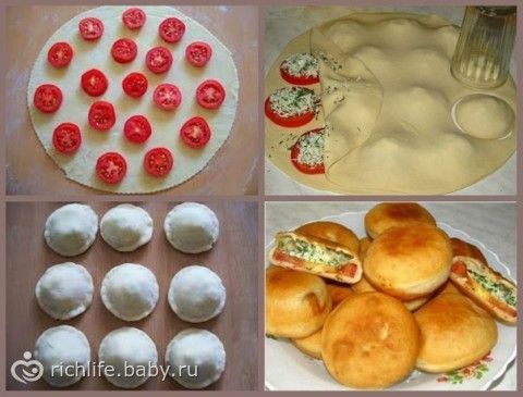 Cтаканом подходящего диаметра вырезать пирожки по контурам каждого кружочка помидора, так поступаем со всеми пирожками.