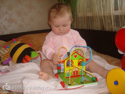 еще пирамидку можно уже дать, пусть научится снимать колечки, потихоньку вместе и надевать научитесь… лабиринт моя очень любила в вашем возрасте(сейчас уже реже с ним играет)...картинки с полугода смотрим… пирамидку просто переворачивает и она вываливается...((я ей все показываю… рассказываю..(