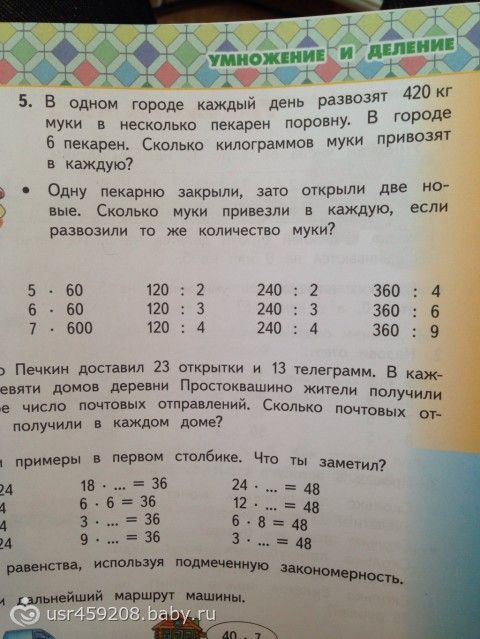 1) 420/6=40(кг). — муки развозили в каждую пекарню.