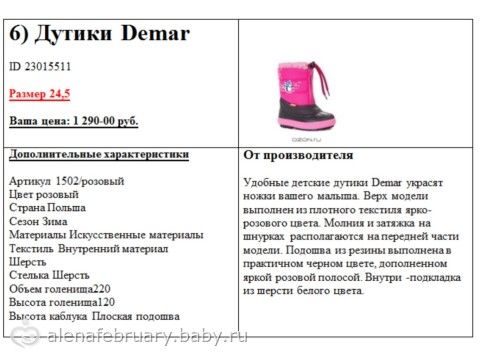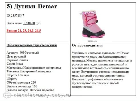 Демары мы купили, одеваем и сейчас, когда совсем холодно. Ножка теплая, под тепленький носочек. Незнаю будем ли носить зимой, все равно буду покупать что то другое и валенки. Вообще поняла я что одними не обойтись.