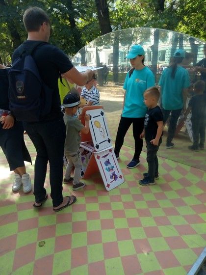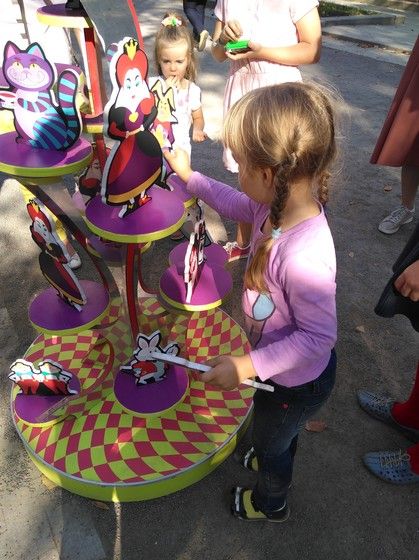 Тут можно было покрутить колесо и поиграть в загадки с Алисой. Аня поиграла и выиграла раскраску.
