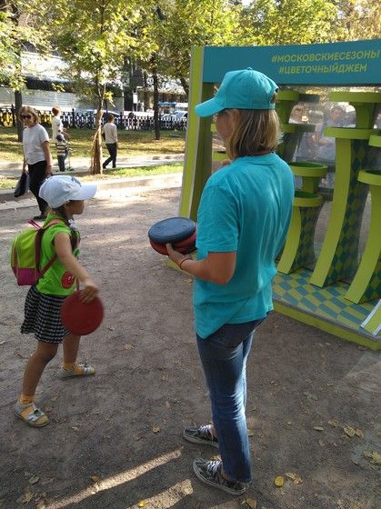 У Синей Гусеницы можно поиграть в Грибы. Аня забрасывает на грибы диск.